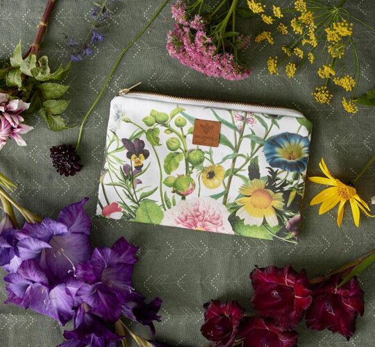 Pungen er hvid med smukt blomsterprint på begge sider. Inderforet er grønt med Jim Lyngvilds gule signaturbi.